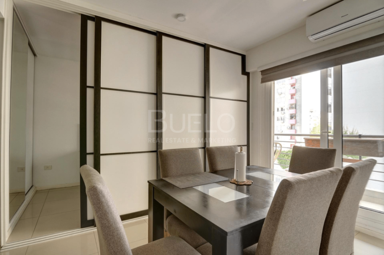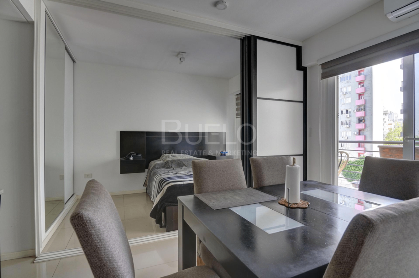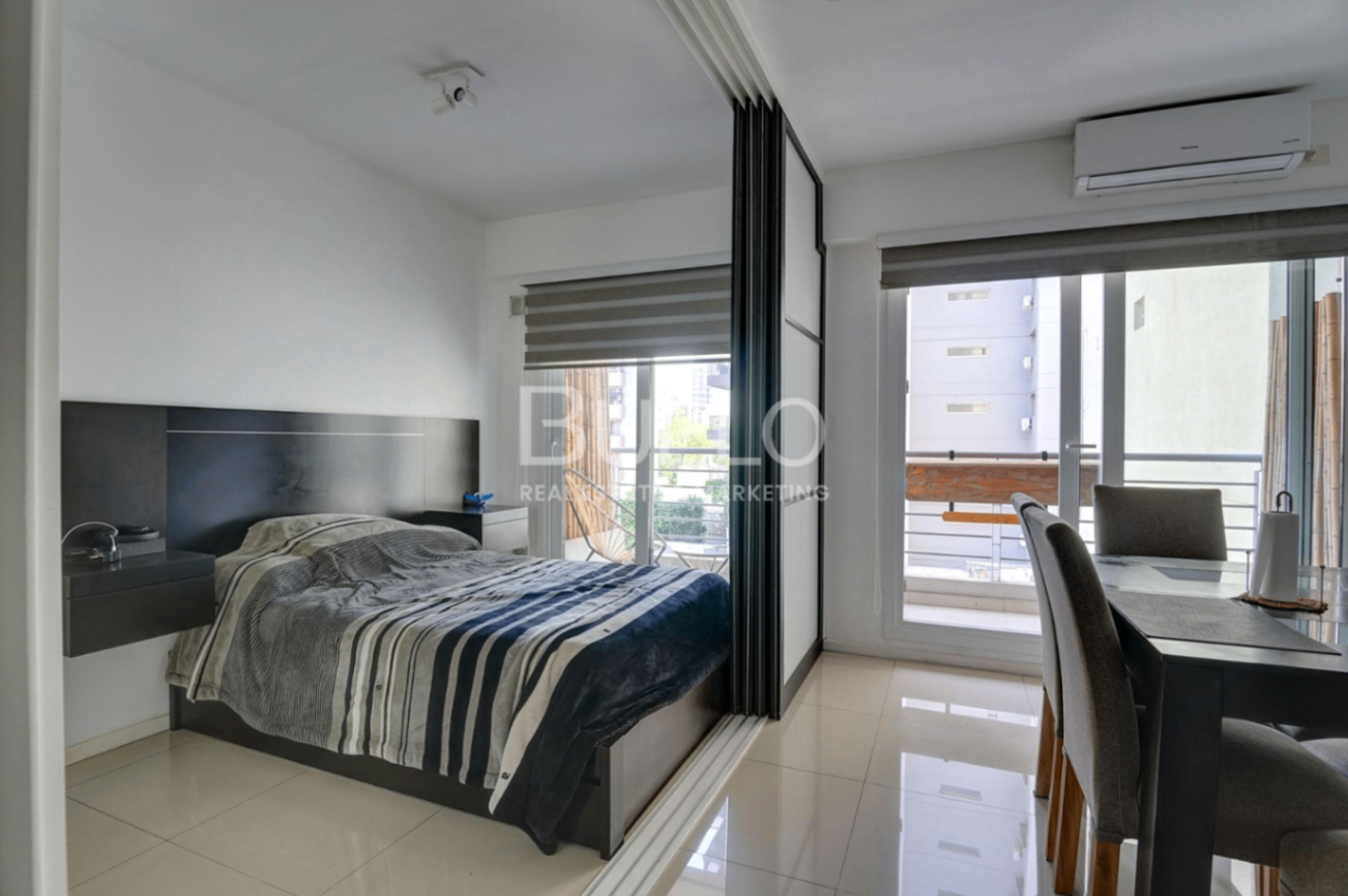 El departamento cuenta con 31,14 m² cubiertos + balcón, disposición contrafrente con vista abierta y una distribución en L que genera una cómoda subdivisión entre el área social y el dormitorio, aportando una sensación de mayor amplitud y privacidad.